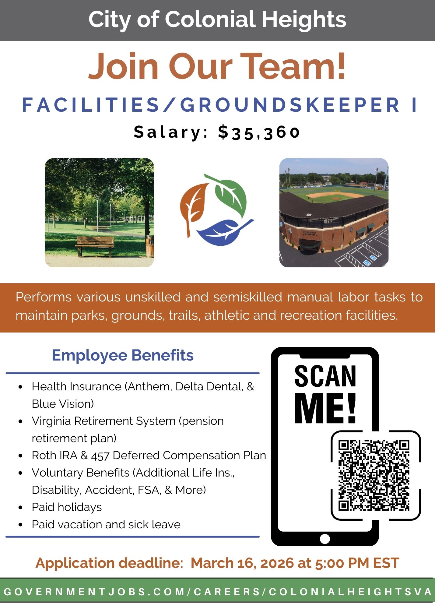Facilities/Groundskeeper I: Performs various unskilled and semiskilled manual labor tasks to maintain parks, grounds, trails, athletic and recreation facilities.
